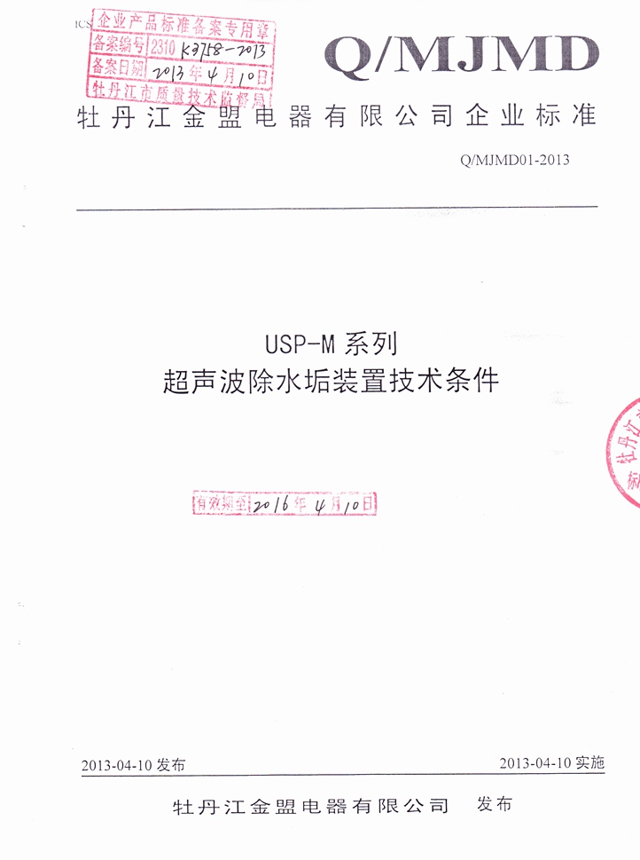 2013年4月10日,牡丹江金盟電器有限公司《USP-M系列超聲波除水垢裝置技術條件》正式通過技術監督局審核通過,同時發布并實施。